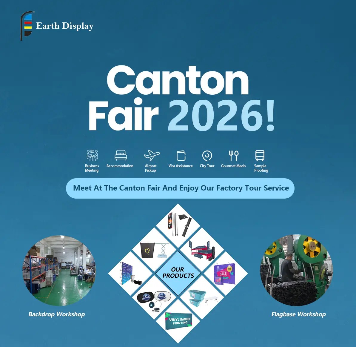 2026 کینٹن میلہ آرہا ہے، اور ہمیں ارتھ ڈسپلے پر واقعی آپ کو وہاں دیکھنے کی امید ہے۔ ہم فیدر فلیگ، پاپ اپ بیک ڈراپس، فلیگ بیسز، حسب ضرورت ونائل بینرز - بنیادی طور پر نمائشوں اور اشتہارات کے لیے کچھ بھی - اب دس سالوں سے بنا رہے ہیں۔ اس بار، صرف آن لائن بات کرنے کے بجائے، ہم آپ کو دکھانا چاہتے ہیں کہ ہم کیا کرتے ہیں، آمنے سامنے۔